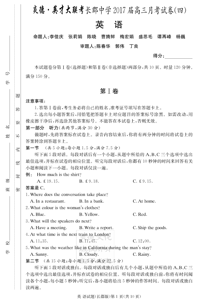 【英語】炎德英才大聯(lián)考2017長郡中學(xué)高三4次月考