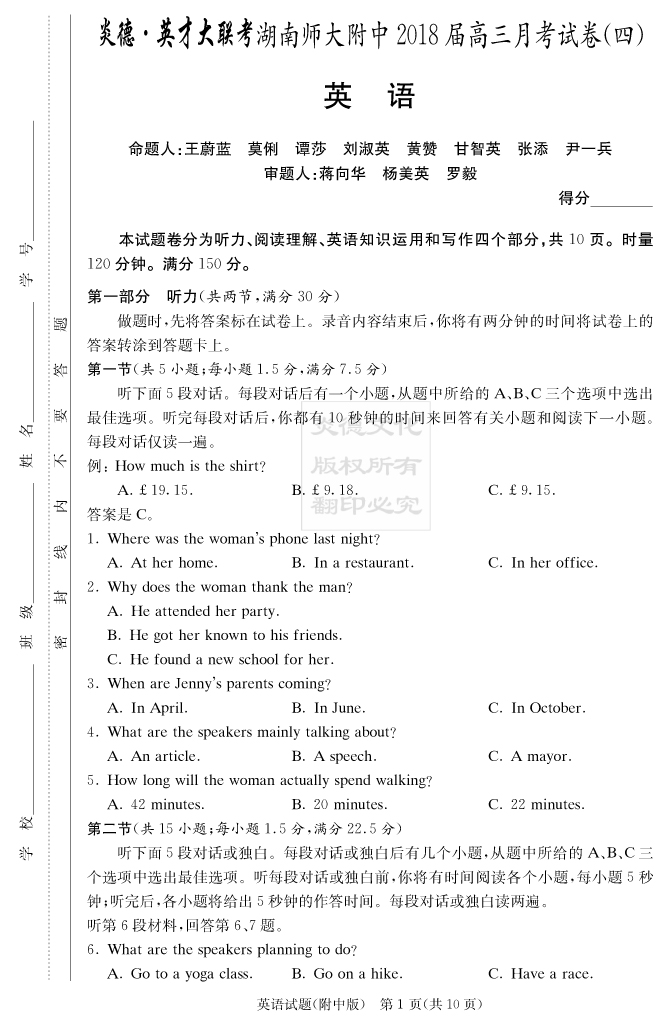 【英語】炎德英才大聯(lián)考2018師大附中高三4次月考