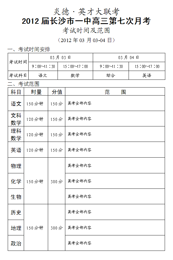 炎德英才大聯考長沙市一中2012屆高三第七次月考考試時間和范圍