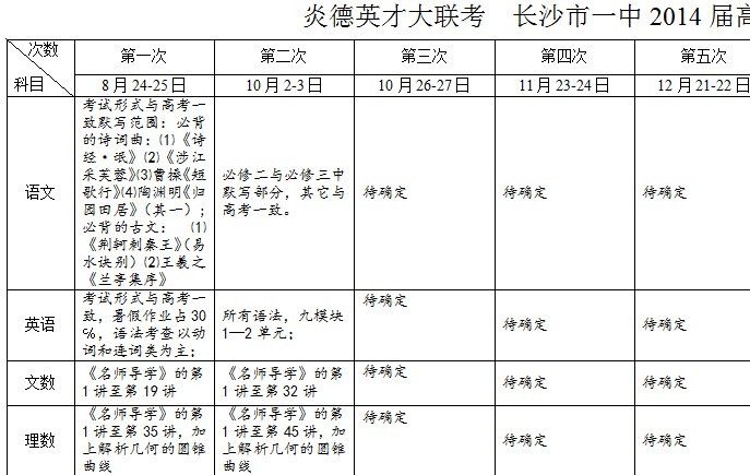炎德英才大聯考長沙市一中2014屆高三月考試卷考試時間和范圍(第1-11次)