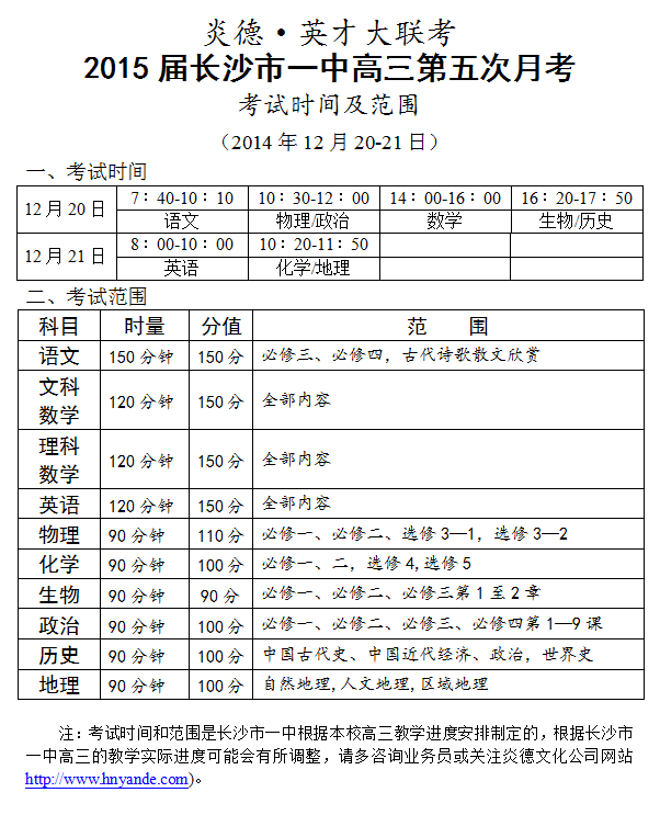 炎德英才大聯(lián)考長(zhǎng)沙市一中2015屆高三第5次月考考試時(shí)間和范圍(2014.12.20-21)