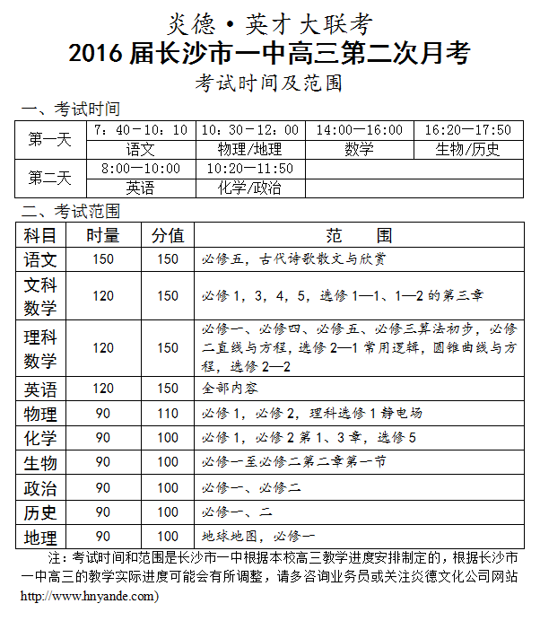 炎德英才大聯考長沙市一中2016屆高三第2次月考考試時間和范圍