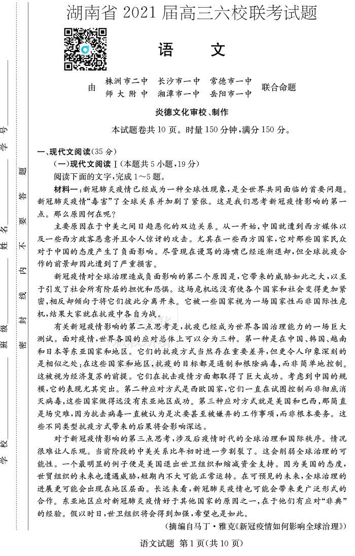 上一篇:【英語】湖南省2021屆高三六校聯考
