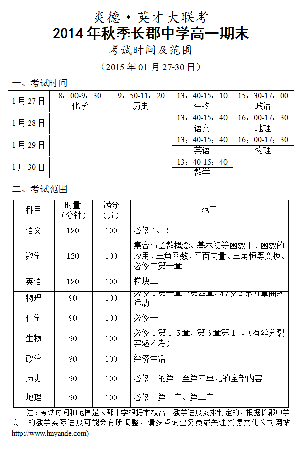 炎德英才大聯考2014年秋季長郡中學高一期末考試時間和范圍(2015.01.27-30)