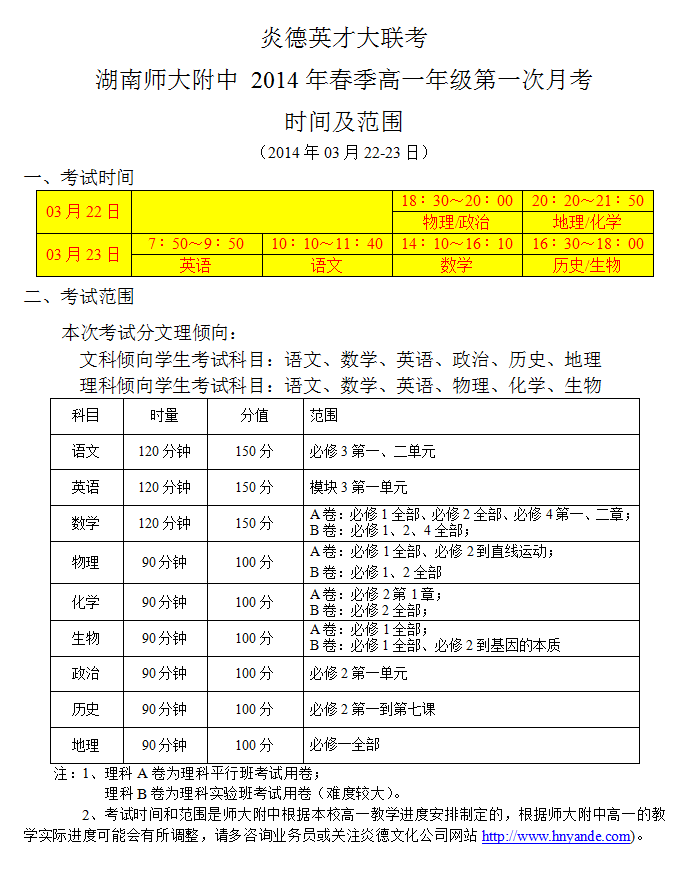 2014年春季師大附中高一第一次月考考試時間及范圍(2014.03.22-23)