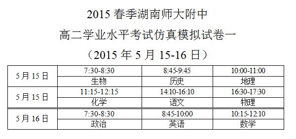 2015春季師大附中高二學業水平考試仿真模擬試卷一考試時間安排(2015年5月15-16日)