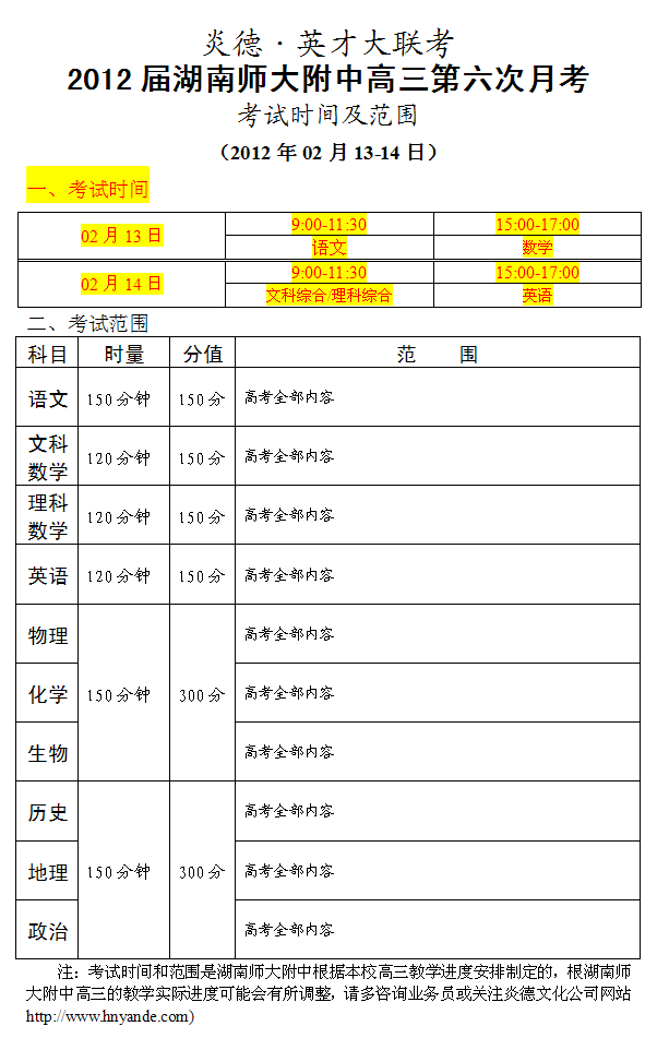 炎德英才大聯考湖南師大附中2012屆高三第六次月考考試時間和范圍