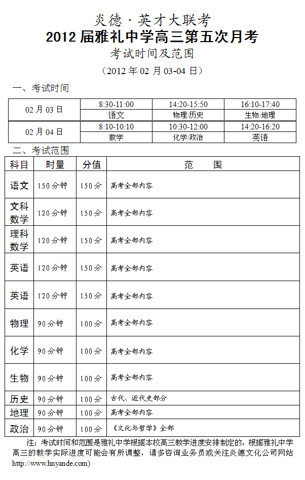 來源:炎德文化點擊:2012-01-31 17:13:21收藏本文當前位置:考試范圍 雅禮中學 高三 正文