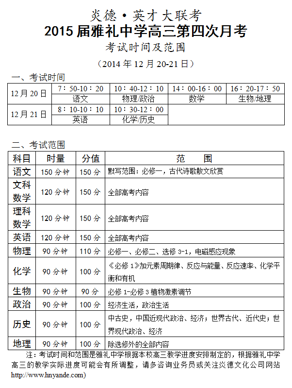 炎德英才大聯(lián)考雅禮中學(xué)2015屆高三第4次月考考試時(shí)間和范圍(2014.12.20-21)