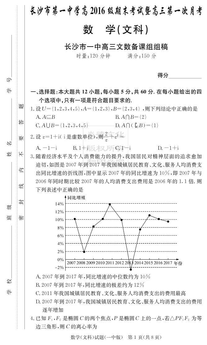 【文數(shù)】炎德英才大聯(lián)考2019長沙一中高三1次月考
