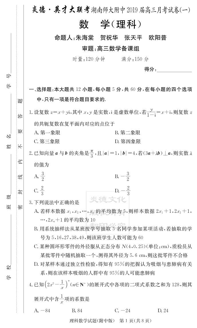 【理數】炎德英才大聯考2019師大附中高三1次月考