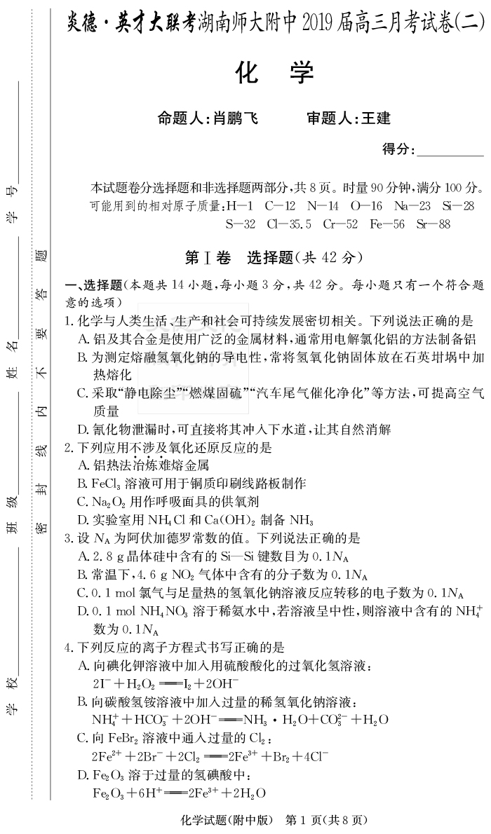 2026湖南師大附中新高考考前小題訓練·化學