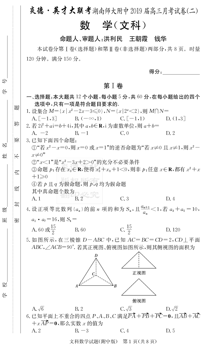 【文數(shù)】炎德英才大聯(lián)考2019師大附中高三2次月考