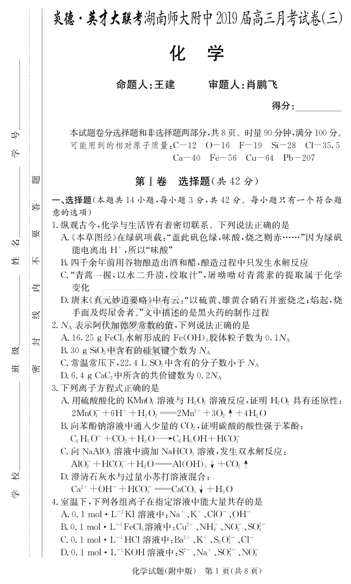 2026湖南師大附中新高考考前小題訓練·化學