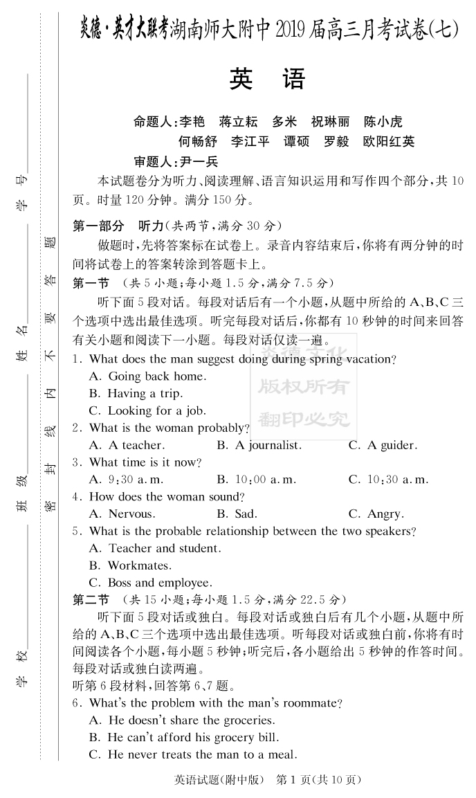 【英語(yǔ)】炎德英才大聯(lián)考2019師大附中高三7次月考