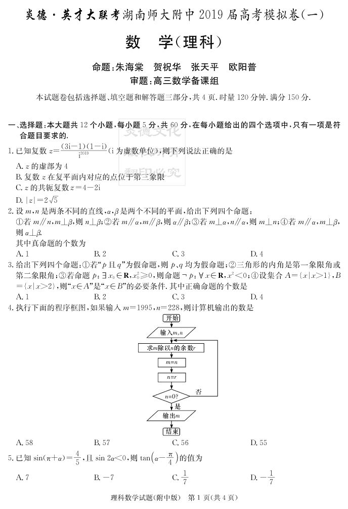 【理數】炎德英才大聯考2019師大附中高三8次月考(模擬一)