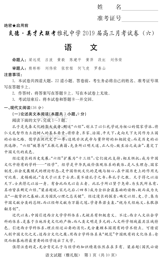 【語(yǔ)文】炎德英才大聯(lián)考2019雅禮中學(xué)高三6次月考
