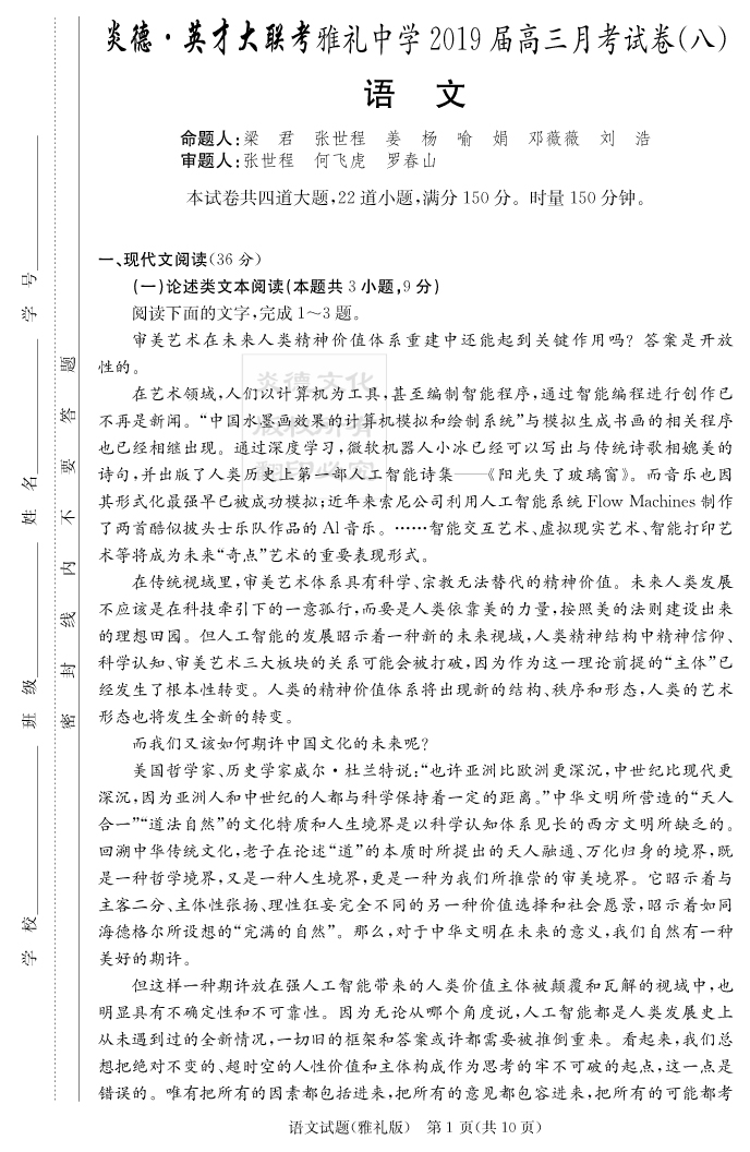 【語文】炎德英才大聯考2019雅禮中學高三8次月考