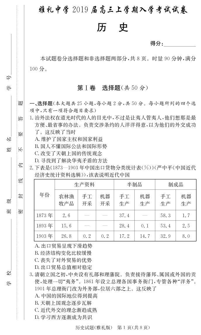 【歷史】雅禮中學2019屆高三上學期入學考試