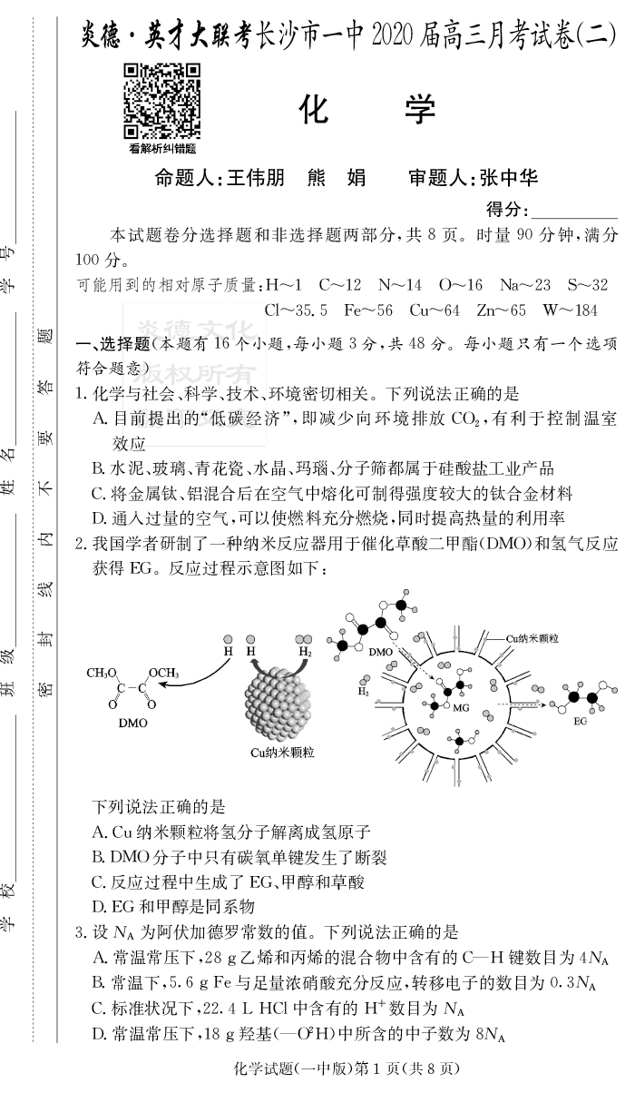 【化學(xué)】炎德英才大聯(lián)考2020屆長沙市一中高三2次月考