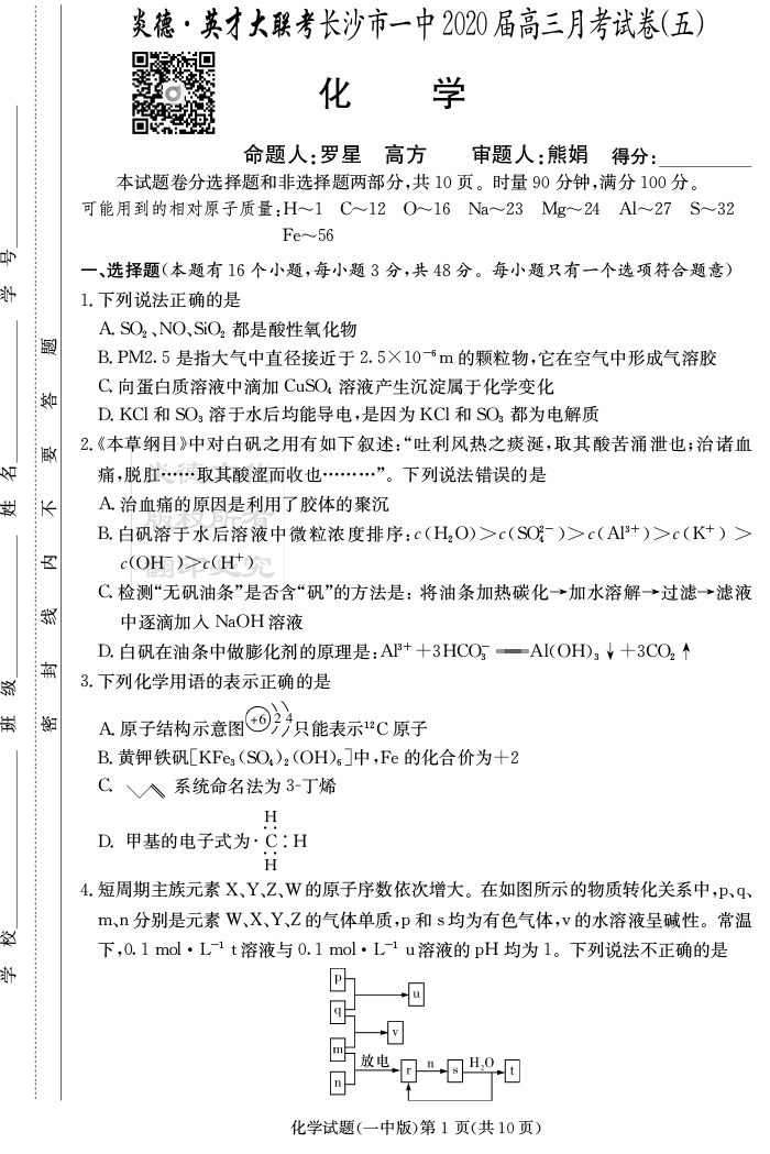 【化學】炎德英才大聯考2020屆長沙市一中高三5次月考