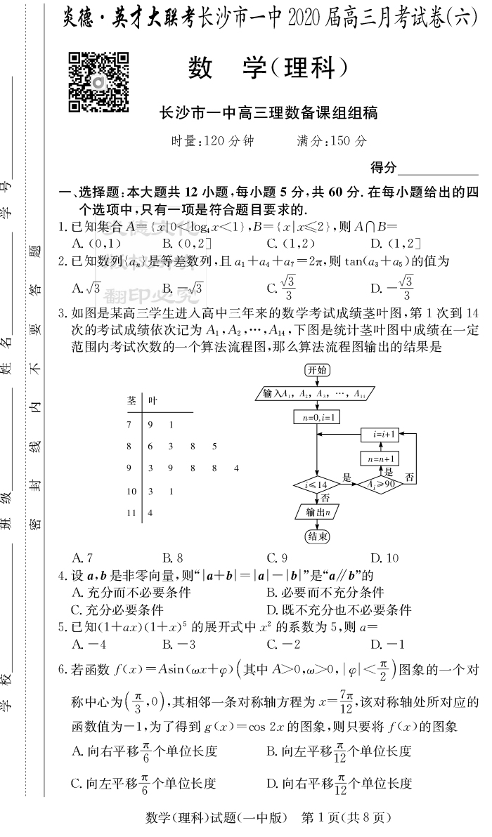 【理數(shù)】炎德英才大聯(lián)考2020屆長(zhǎng)沙市一中高三6次月考