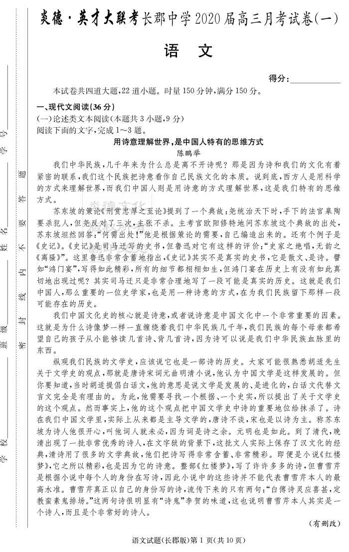2026湖南師大附中新高考考前小題訓練·語文