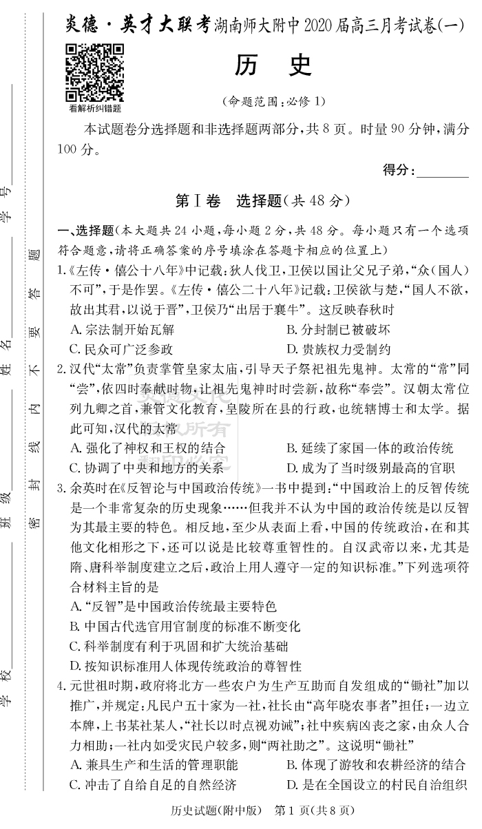 2026長郡中學新高考考前小題沖刺訓練·歷史