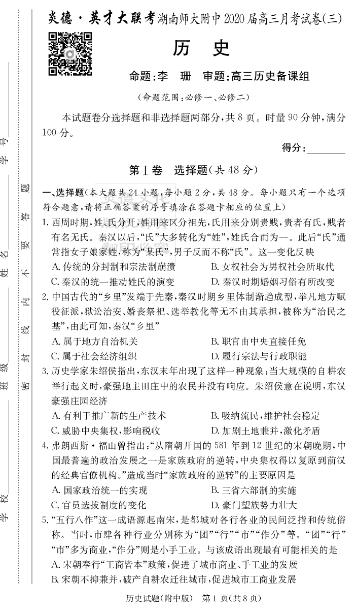 2026長郡中學新高考考前小題沖刺訓練·歷史
