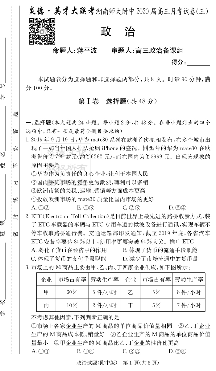 2026湖南師大附中新高考考前小題訓練·政治