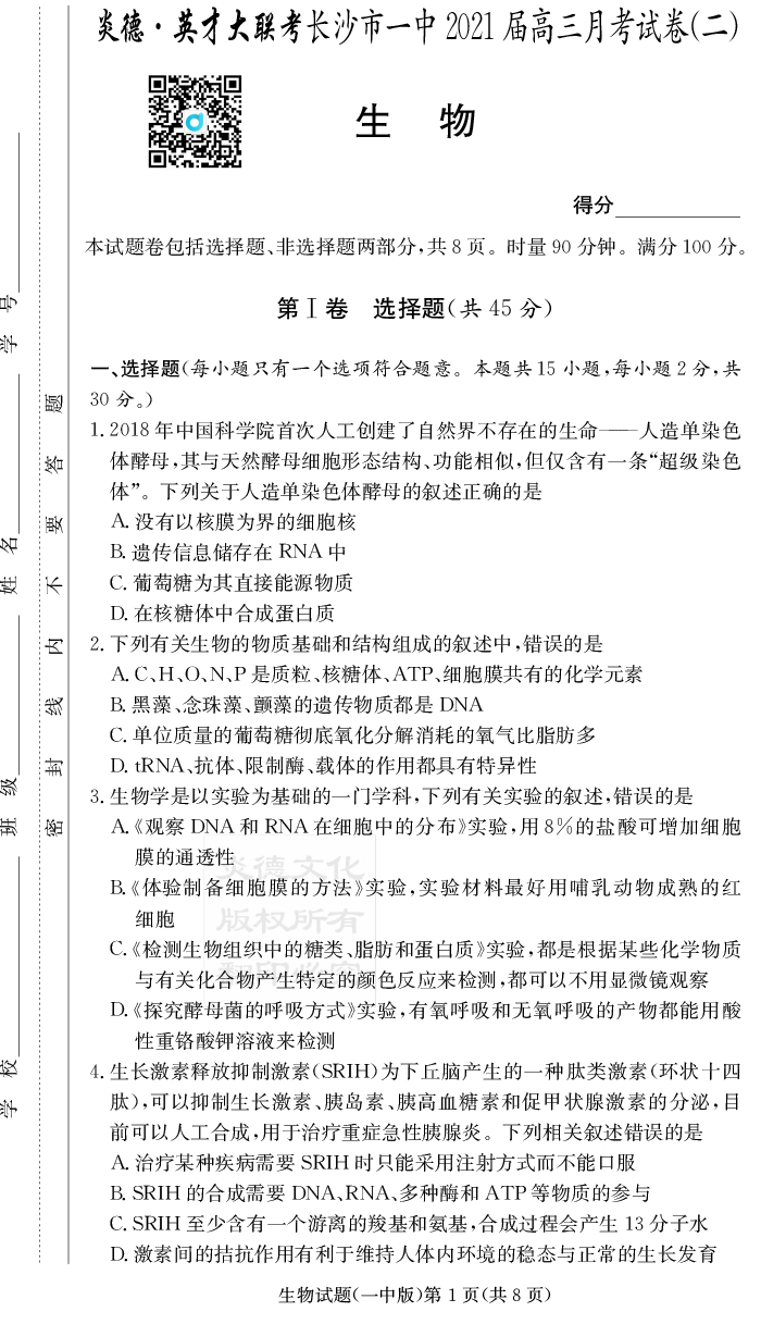 2026長郡中學新高考考前小題沖刺訓練·生物