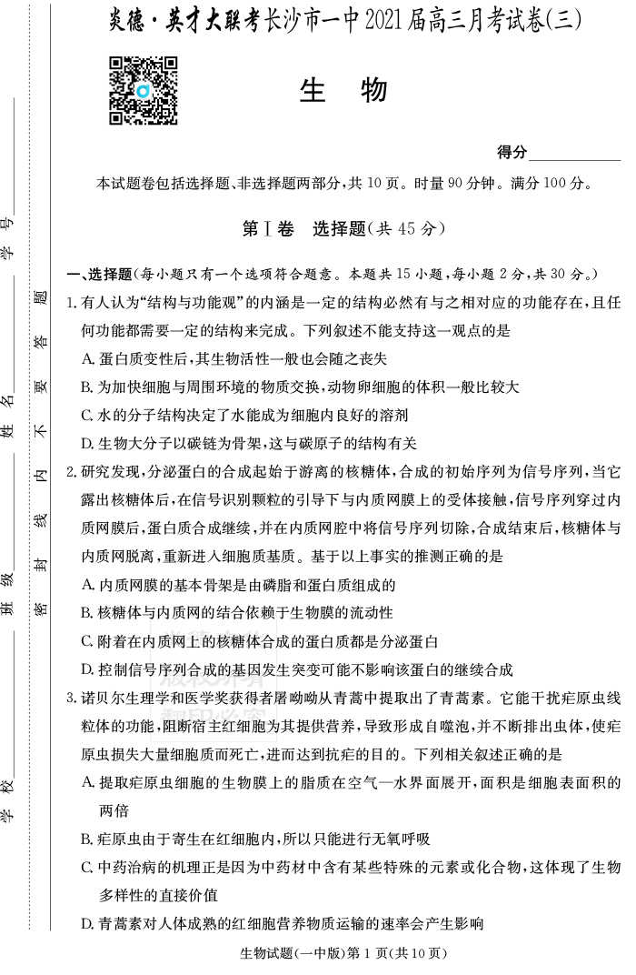 2026長郡中學新高考考前小題沖刺訓練·生物
