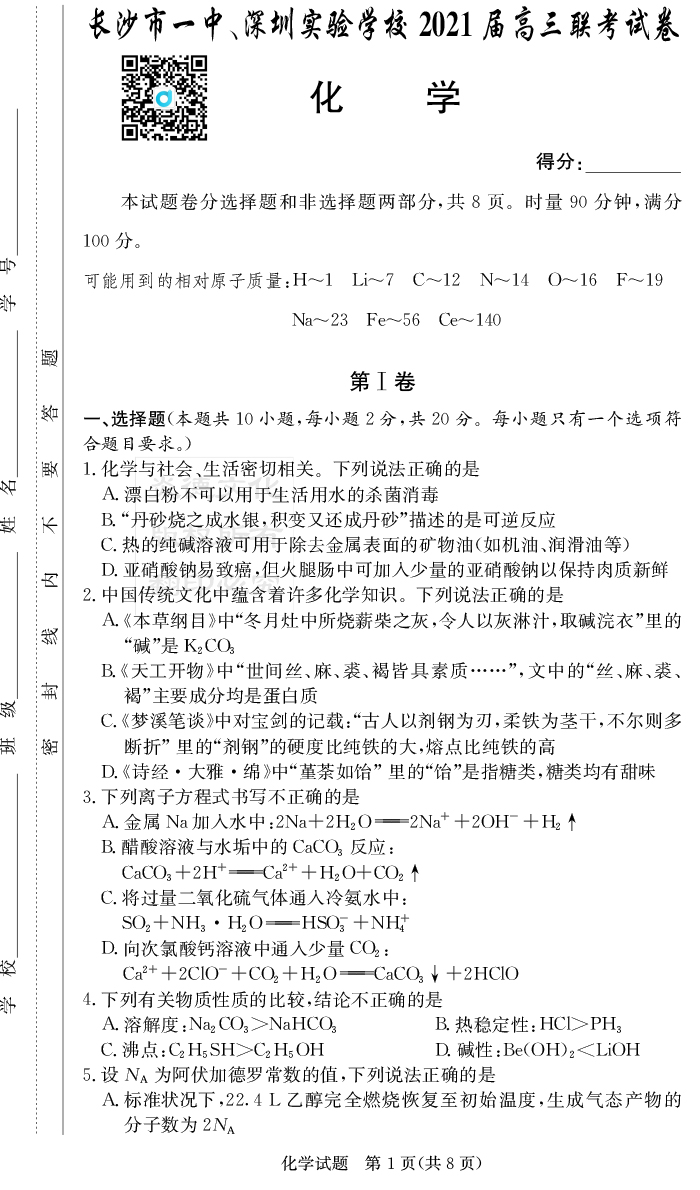 2026長郡中學新高考考前小題沖刺訓練·化學