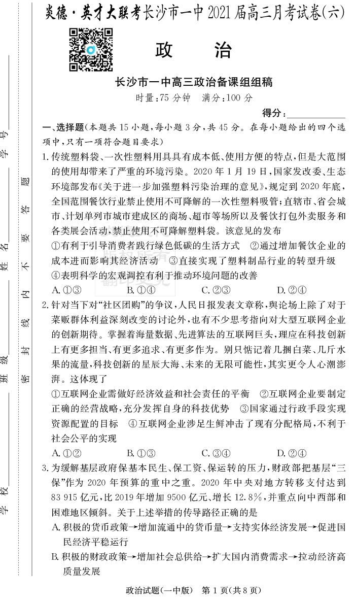 2026長郡中學新高考考前小題沖刺訓練·政治