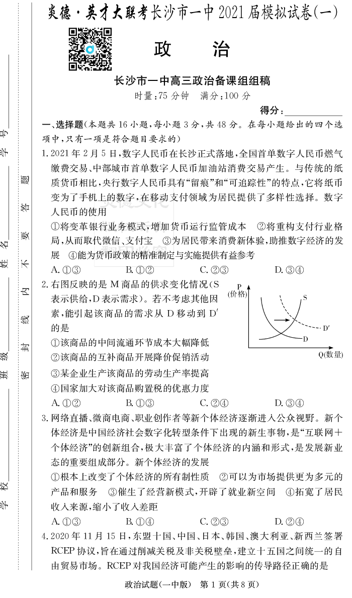 2026長郡中學新高考考前小題沖刺訓練·政治
