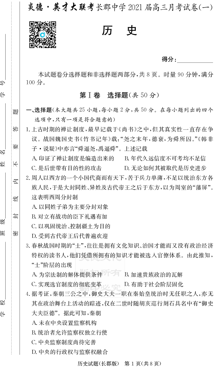 【歷史】炎德英才大聯考2021屆長郡中學高三1次月考