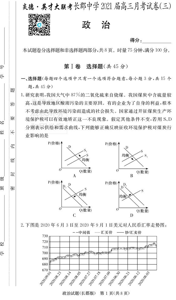 2026長郡中學新高考考前小題沖刺訓練·政治