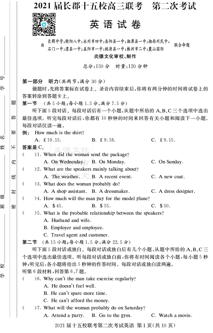 【英語】炎德英才大聯考2021屆長郡中學高三8次月考(十五校聯考二)