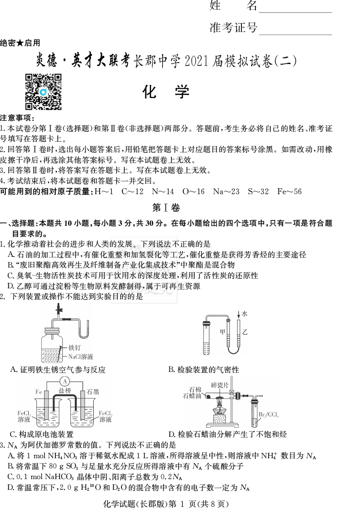 【化學】炎德英才大聯考2021屆長郡中學高三10次月考(模擬二)
