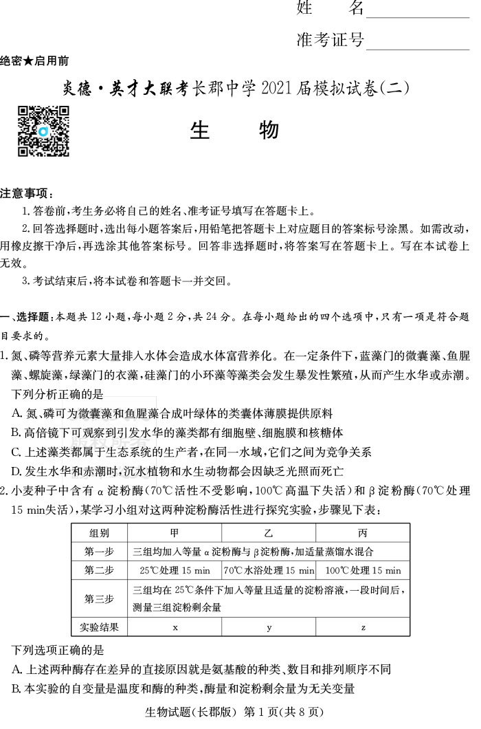 2026長郡中學新高考考前小題沖刺訓練·生物