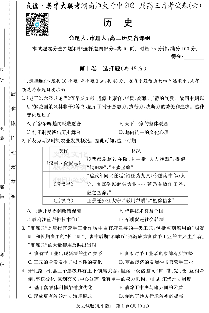 2026長郡中學新高考考前小題沖刺訓練·歷史
