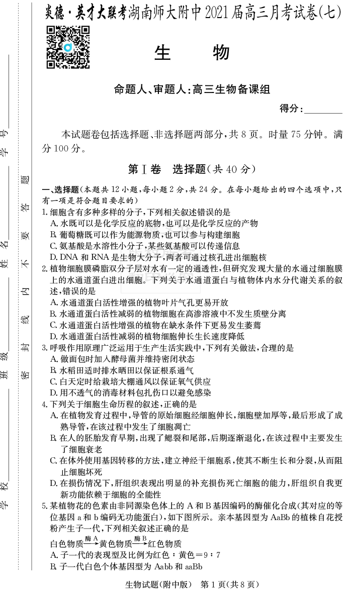2026湖南師大附中新高考考前小題訓練·生物