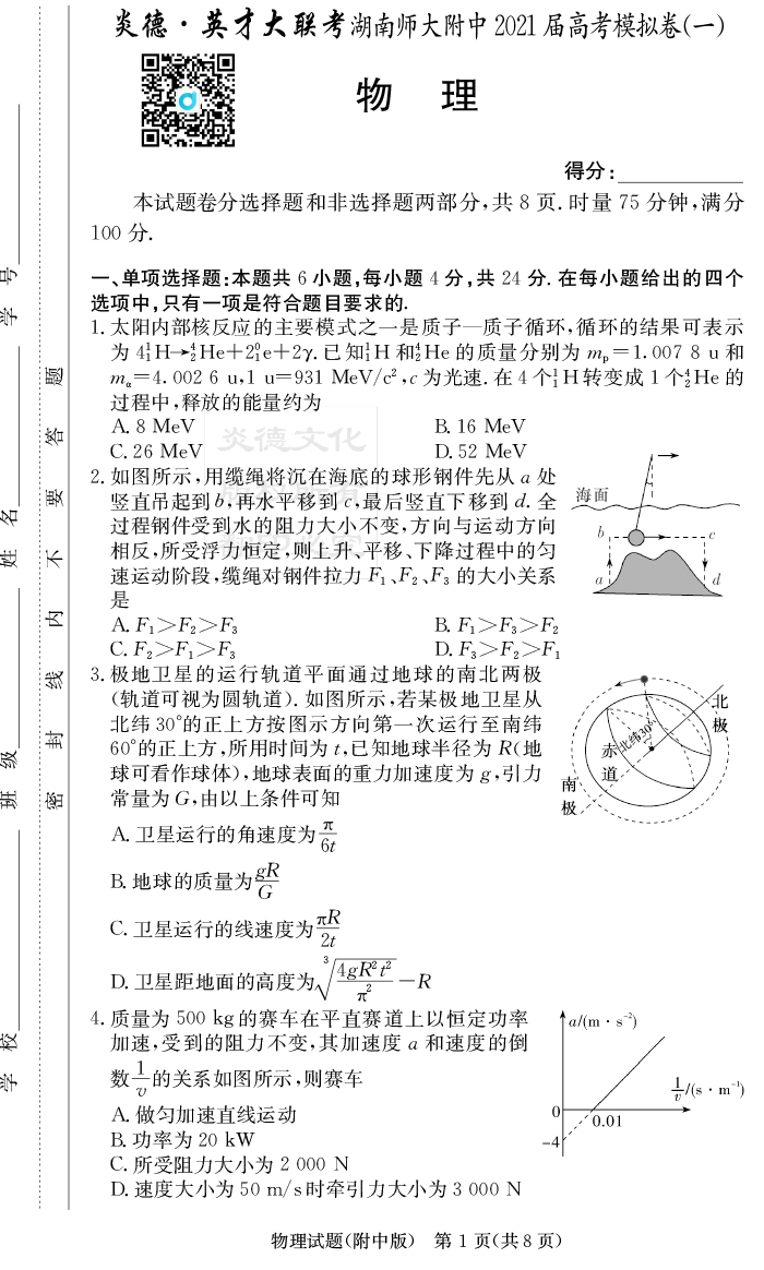 2026湖南師大附中新高考考前小題訓練·物理