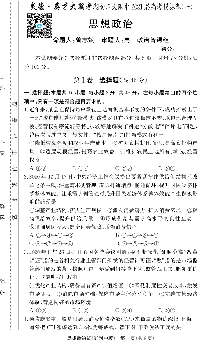 2026長郡中學新高考考前小題沖刺訓練·政治