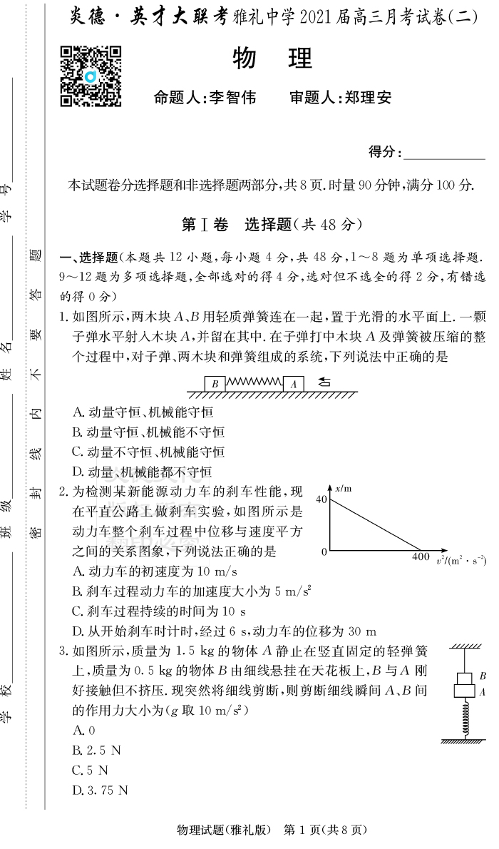 【物理】炎德英才大聯考2021屆雅禮中學高三2次月考