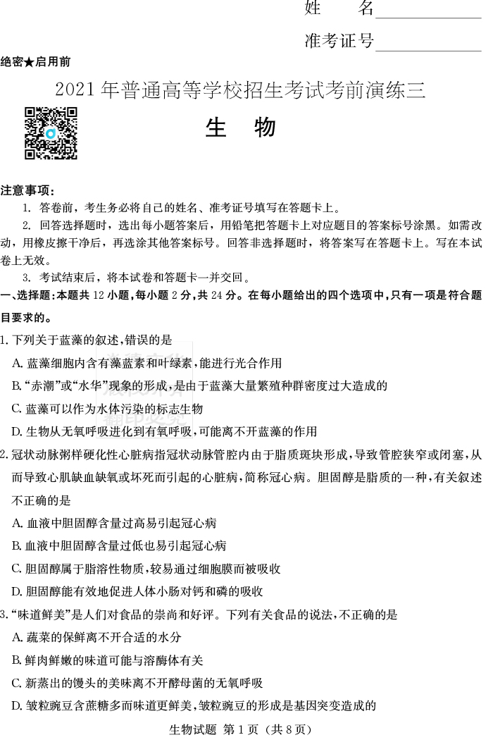 下一篇:【數學】2021年普通高等學校招生全國統一考試考前演練(三)