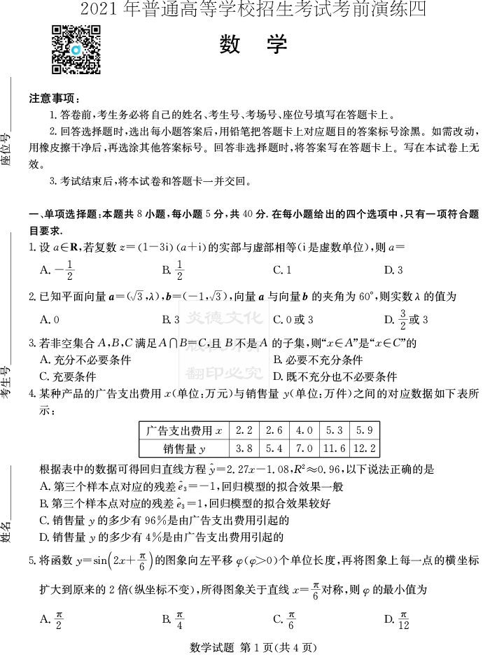 上一篇:【生物】2021年普通高等學校招生全國統一考試考前演練(四)