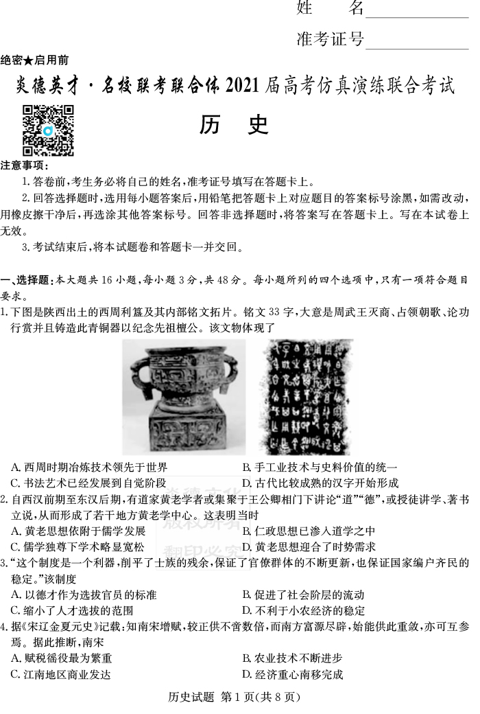 2026湖南師大附中新高考考前小題訓練·歷史