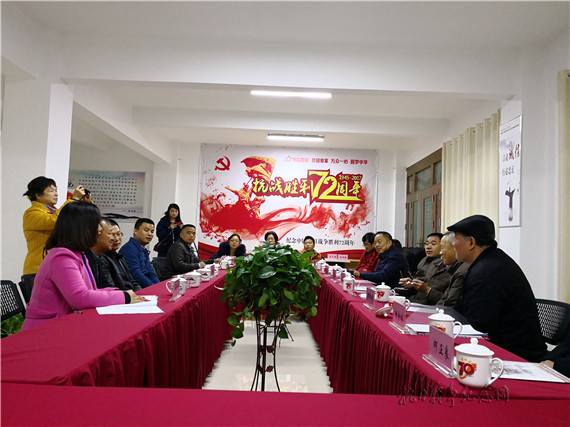 長沙市抗戰文化研究會會長、抗日戰爭紀念網主編、抗日戰爭圖書館館長何譽軍(右二)向長沙市關工委主任董學生(右三)等介紹抗日戰爭圖書館館藏資料