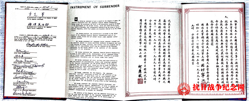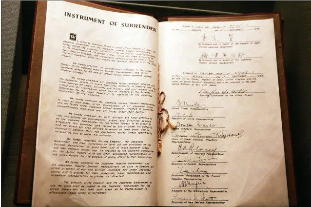 這是英文頒布的天皇的《終戰(zhàn)詔書》,在東京灣停泊的密蘇里號戰(zhàn)列艦上簽。(美國西點軍校陳列的原件照片)